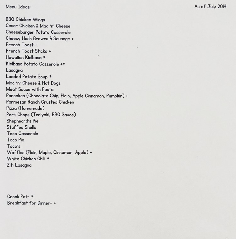 This is something that I started a couple months after we got married. When I lived with my parents (I lived with them and my younger sister until I got married), there were three other people in the house to help give ideas each night for dinner. Once I got married it was on me (I’m the picky eater so my husband didn’t like to give ideas). It sounds stupid, but dinner became something that I dreaded (yeah, I know, I’m dramatic sometimes). I would stress about it all day trying to be the perfect housewife who had dinner ready when her husband got home from work (or rather got out of bed since he worked 3rd shift). That failed quickly and I knew that I needed a new system.