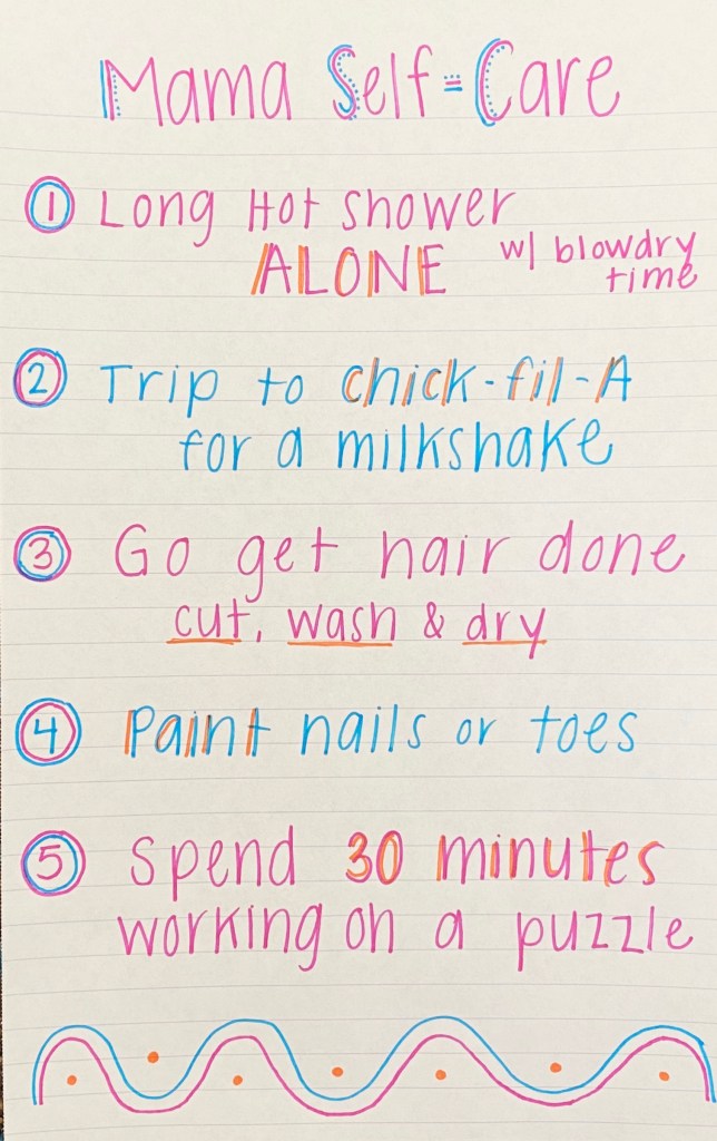My challenge for you this week (or when you get a minute) is to make a quick list of your “self-care” options. That way you have something to look at and choose from. You can take ideas from above or add your own. I’ll share mine below.