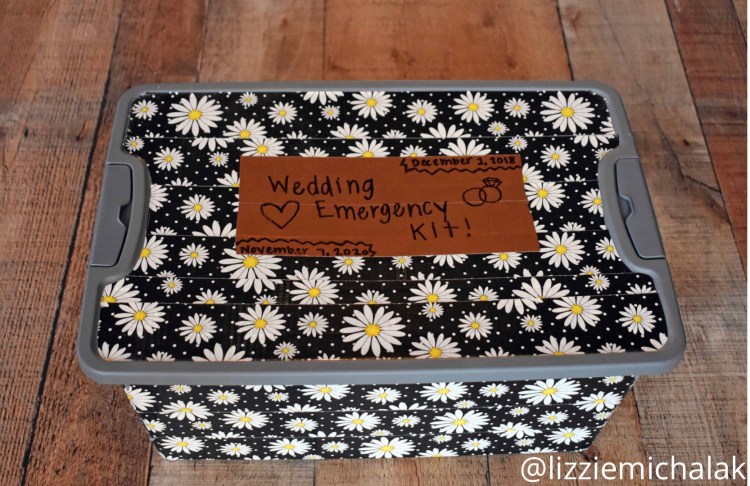 Our “Wedding Emergency Kit” pictured with our wedding dates.