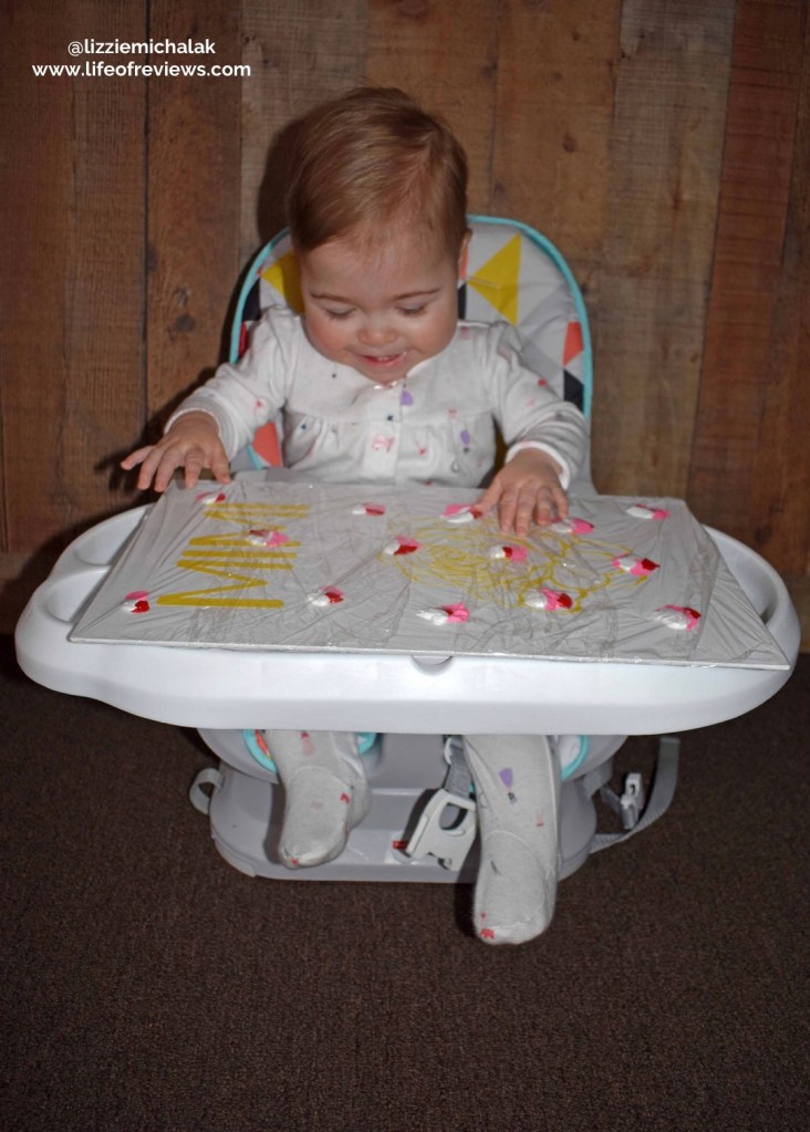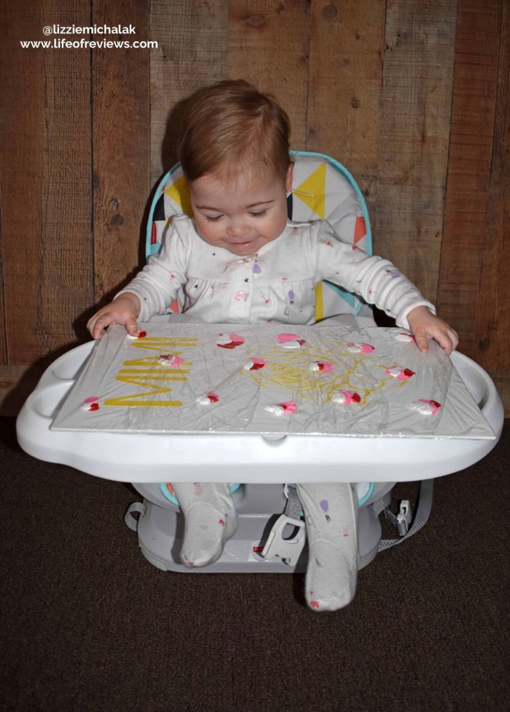 Step 4: Set your toddler up in a place with space to work. I put my toddler in her high chair so that she could focus on the activity at hand. Take pictures and have fun with this part. I loved watching her try to figure out what I was giving to her. When it looks like your toddler is finished, take it away. If you see any spaces that your toddler missed, make sure to smoosh some paint there (unless you truly want it to just be their project).