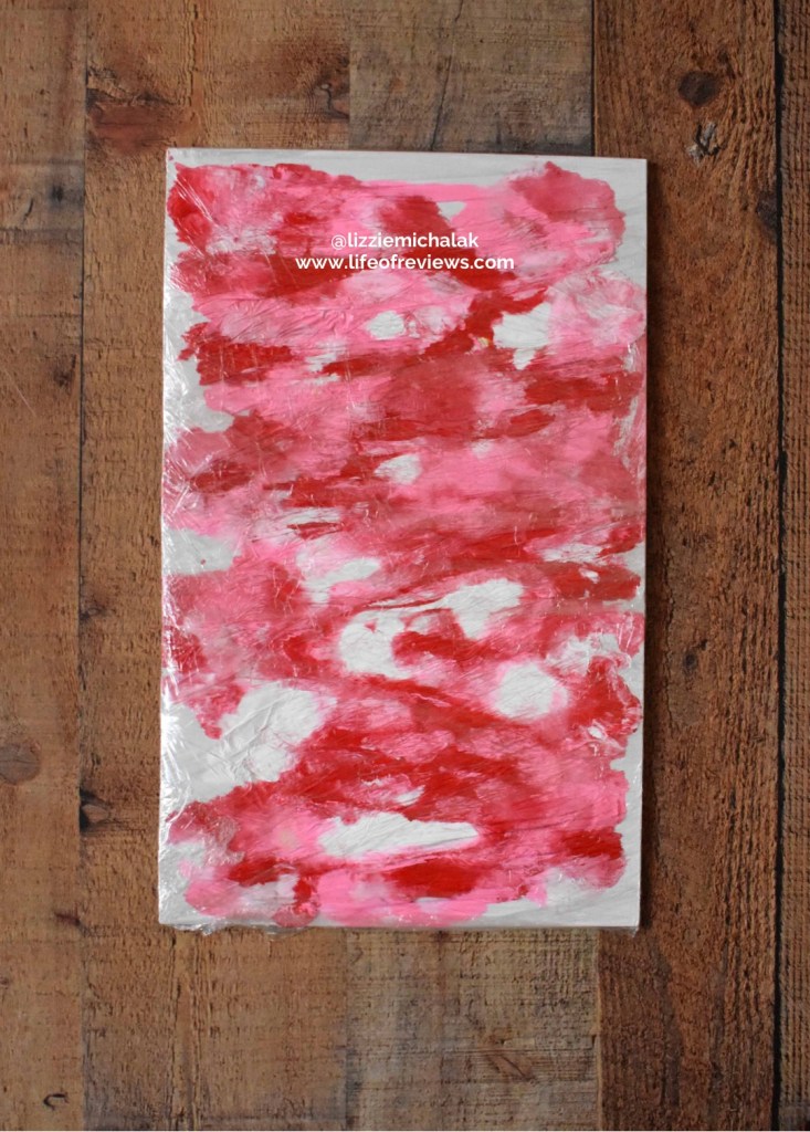 Step 3: Carefully wrap the plastic wrap around the canvas. Add layers. The first time I did this, I only used 2 layers and my toddler used her nails to tear through and get to the paint. I suggest at least 4.