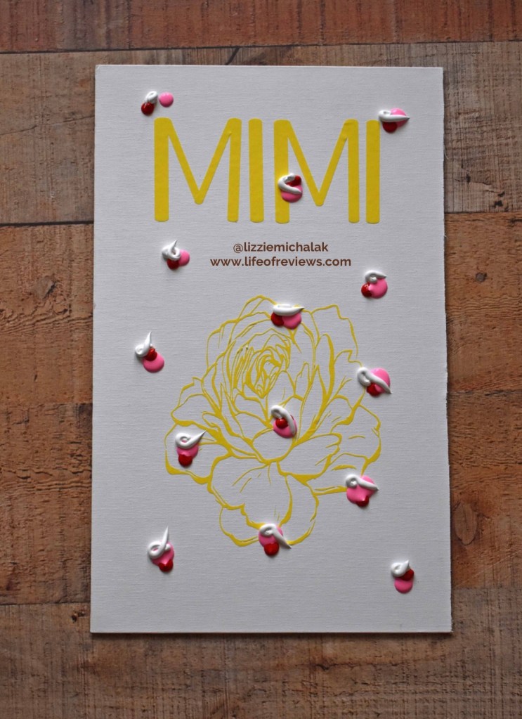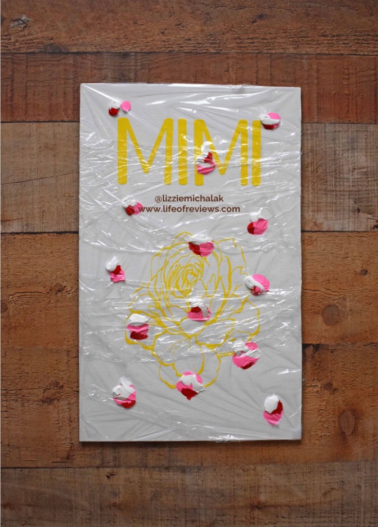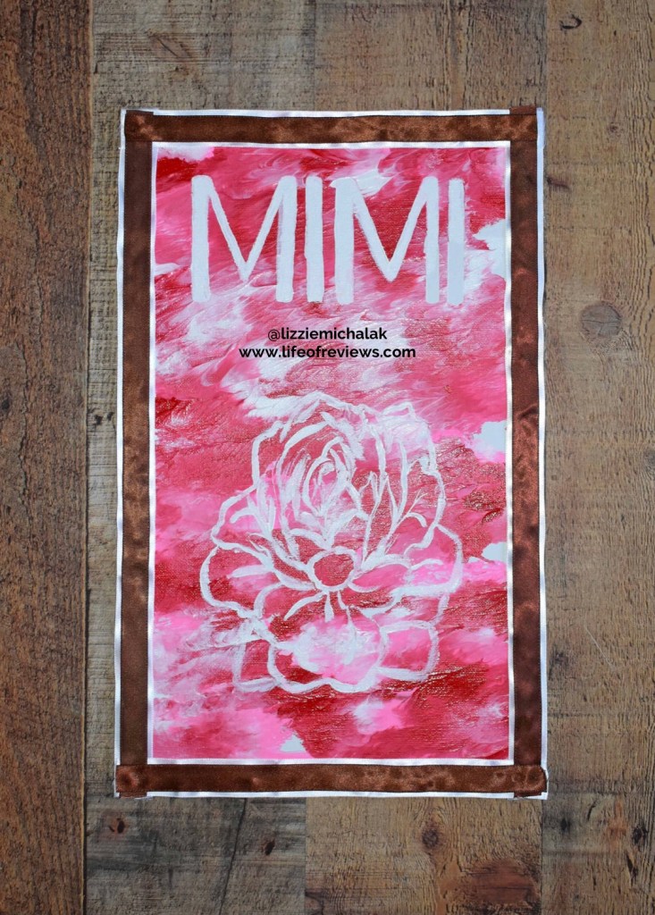 Step 1: Choose an image that you want on the canvas. I knew that this project was going to be a gift, so I chose the name “Mimi” and her favorite flower. I cut the images on my Cricut (a crafting device) and placed them on the canvas. Make sure that each piece is FIRMLY down on the canvas (I did not, and paint seeped under the vinyl). If you do not have a Cricut (or a friend with one) you can order one on Etsy and someone will cut it for you (that option is still under $5).