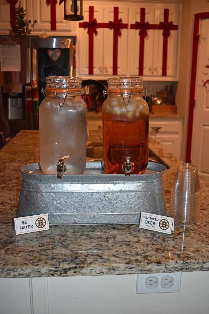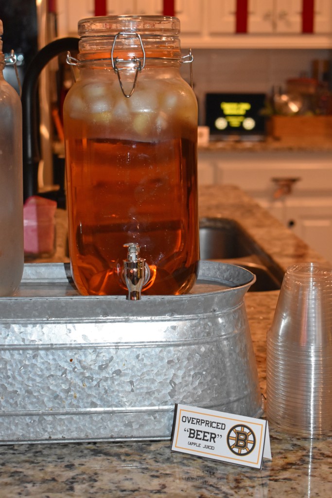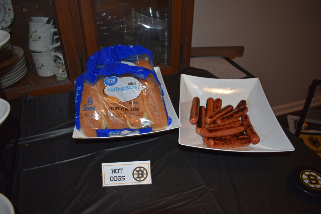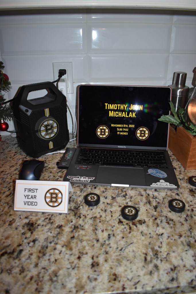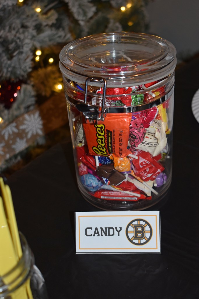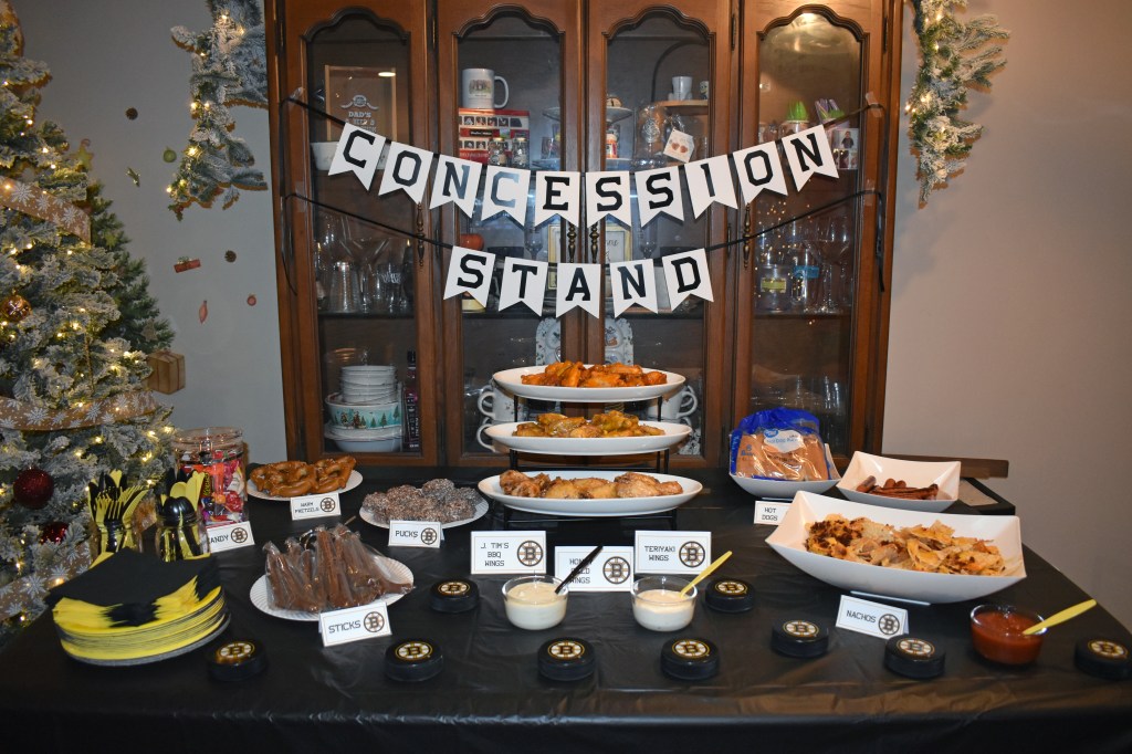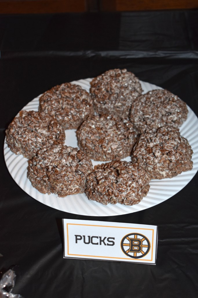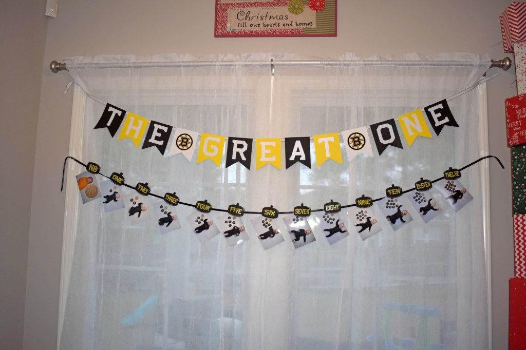 DECOR – One Year Banner: The Great One on a pennant banner || One Year in Pictures: I hung them on pucks. The pucks were glued to ***** and then strung on ribbon. You can use monthly pictures of just random pictures from your little one’s first year. || Concession Stand Sign: I made this, but you can also just buy one! It was hung over the food table. || Mini Pucks and Actual Pucks: These were purchased for this first year pictures but we used them for decor along with anything that we had around the house that was Bruins themed. This helped me save some of the budget for other things. || NOTE: Never be afraid to just add balloons and store bought basic colored decor (we can’t use balloons because someone at our party was allergic).