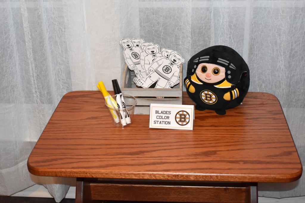 ACTIVITIES – Floor Hockey: This was just a simple fun game and it cost $25 and can be kept for years to come. I painted mine to match the team, but you can also find your teams hockey net already made up. || One Year Video: This was time consuming but every year I make the kids videos for their birthdays and this year I decided to include them in as something for party goers to do! || Blades Color Station: I printed out pictures of our teams mascot and glued them on a popsicle stick for the kids to color and take pictures with. You can find your teams mascot by googling.