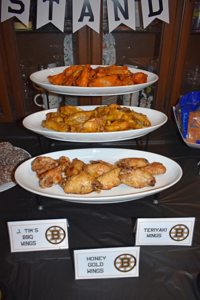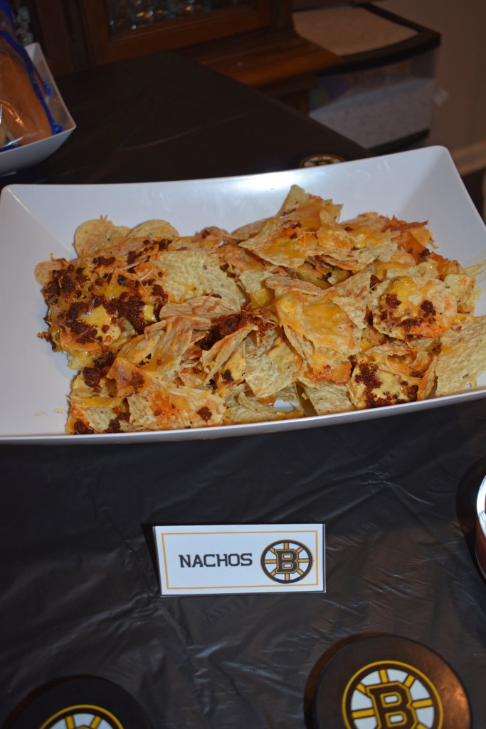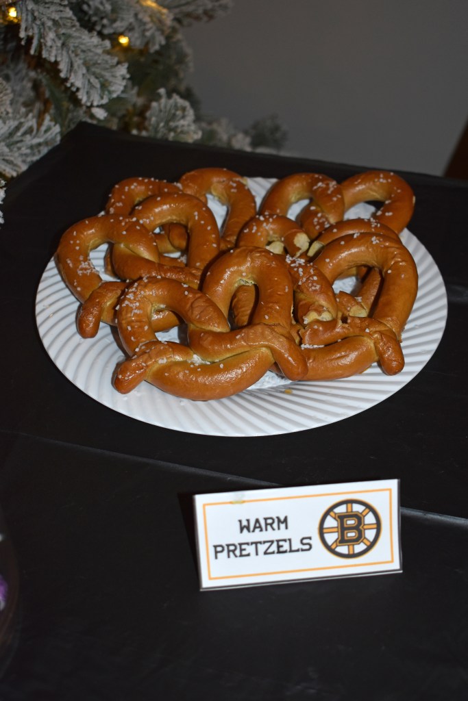 Sticks: Chocolate covered pretzels with tootsie rolls at the end || Pucks: Chocolate Rice Krispy Treats shaped like pucks || Candy: Any candy will work || Nachos: We just did simple chorizo and cheese nachos || Mini Warm Pretzels: I just bought the frozen ones || Hot Dogs: The cheapest options here || Wings: We used some fancy sauce that we brought back with us from J. Timothy’s tavern. They do ship if you want to have the best wings ever for the party, but you can really make any wings, or just buy pre-flavored ones.