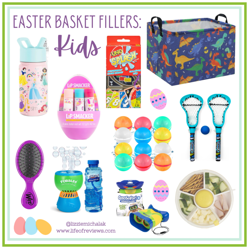 Kid Basket: Basket (so many options), Water Bottles, Mini Wet Brush, Chapstick Egg, Binoculars, Sticker Books, GoBe Snack Spinner, Bubble Machine, Uno Splash, Ball Toss, Reusable Water Balloons
