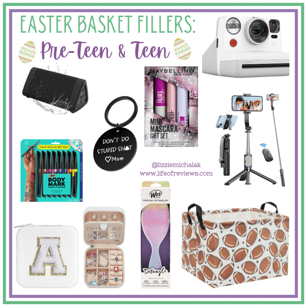 Teen Basket: Basket (so many options), Wet Brush, Hair Ties, Burts Bees Essentials Kit, Make up bag, Funny Key Chains, Personalized Jewelry Holder, Polaroid Camera, Tattoo Markers,