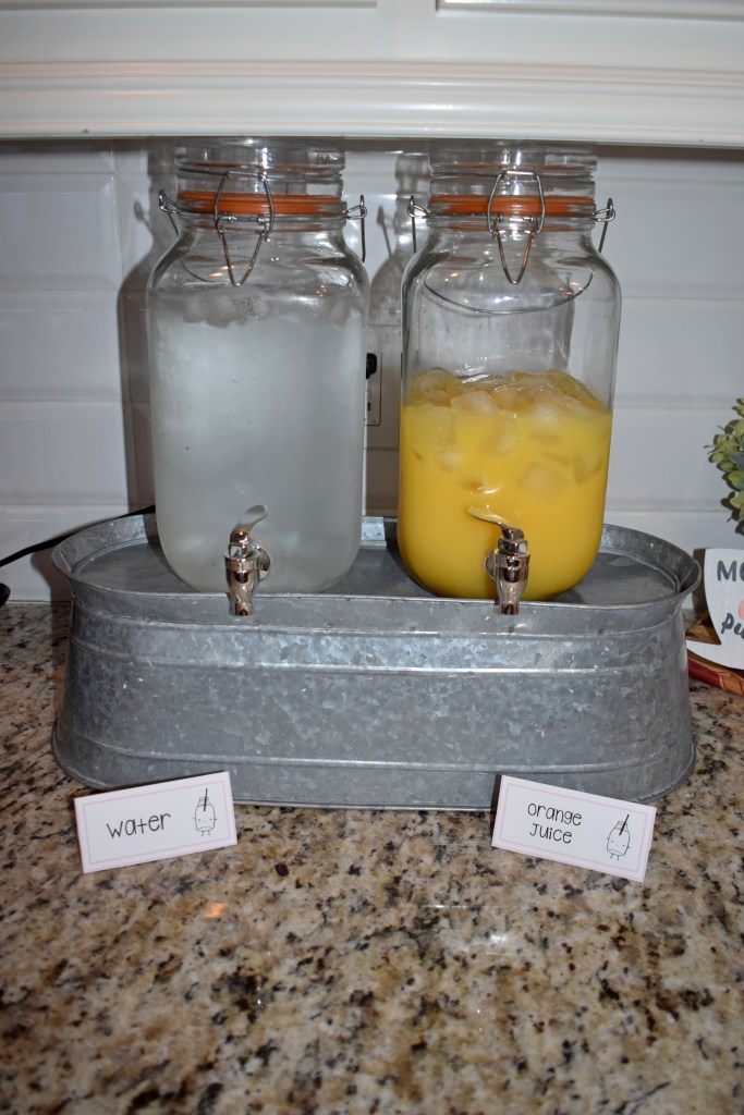Beverages: Orange Juice and Water. My mother in law got this drink dispenser at Kirklands, but I found a really nice one that I will link for you here. These can be used for every party that you host.