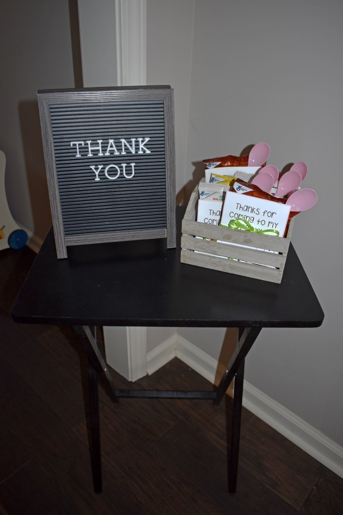 Party Favor: I wish that I took a better picture of the party favors, but it was a bag of cereal with a spoon and a thank you note attached with curling ribbon. So cute and so easy. You can use the boxes of cereal but I prefer the bags.