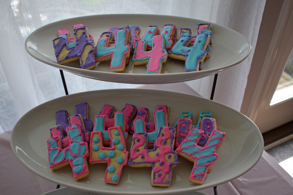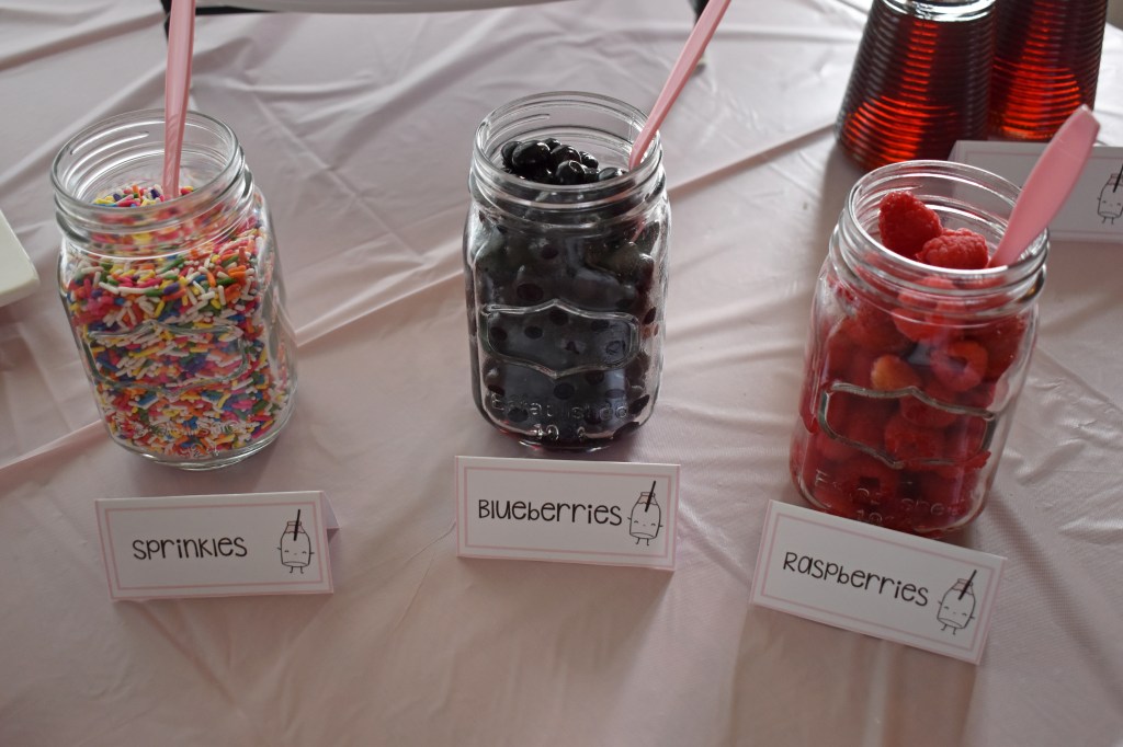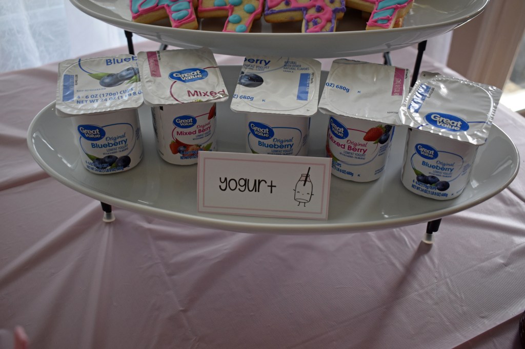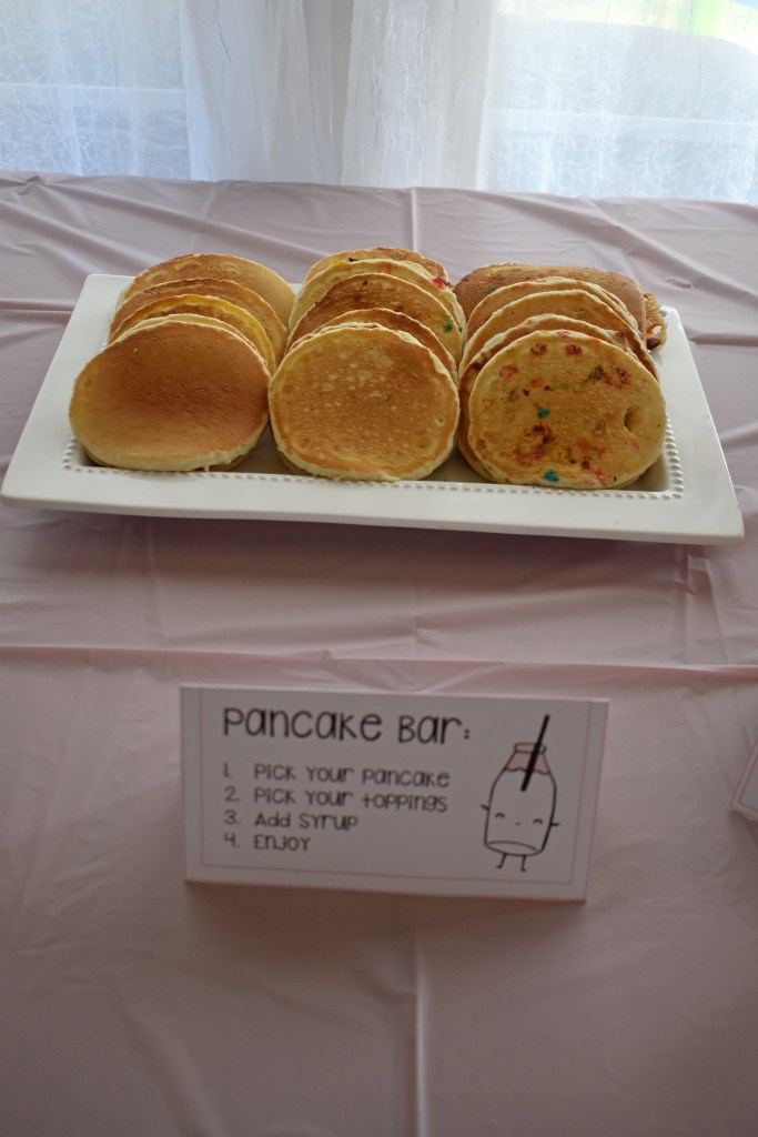 Toppings: You can choose any toppings but we went with, fresh strawberries, cut up bananas, chocolate chips, sprinkles (my favorite), frozen blueberries and fresh raspberries. I always have mason jars on hand so that was an easy way to serve them. || Syrup: Grab these super cute glass serving jars for them. You won’t be disappointed. || Pancakes: I made 2 different kinds of pancakes, buttermilk and m&m. Both were popular. You can make as many flavors as you want, but that is what I chose to do for simplicity || Whipped Cream: You can get as fancy or as simple as you want. Make your own or just buy one from the store, but this is a must of course || Yogurt: This was not a super popular choice, but I felt like I needed something else. I also thought about just having some greek yogurt and granola out there, but did this instead. || Cookies: My daughter is not a fan of cake so we just did our best to make cookies for her. They were absolutely delicious. Things don’t have to look perfect, but they sure do need to taste good. Both the cookies and the yogurt were on a three tiered tray. I couldn’t find the link to my exact one, but I found a cute one that is similar, I use this for so many parties.