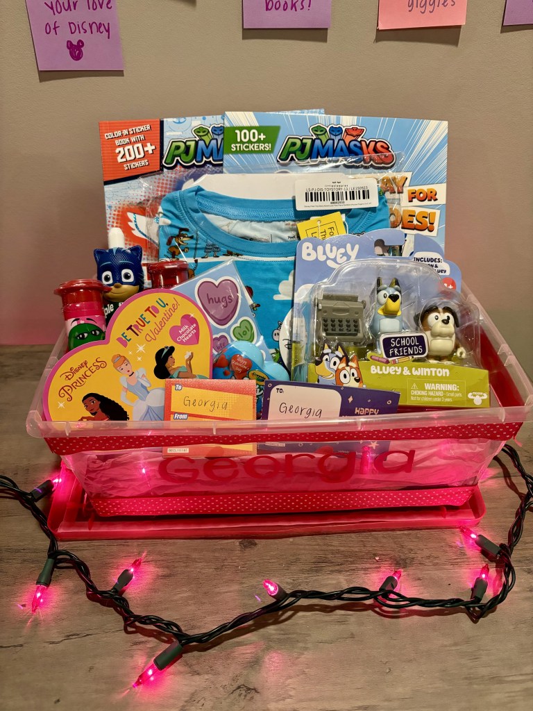 Following the same budget I created these boxes this year. Although your time is limited if you want to pull this together right now, my favorite place to get basket and box fillers is the clearance section OR the used tab on Amazon. Kids don’t need fancy shiny things and the point of doing the box this way is to just bring them a little joy each of the days leading into Valentine’s Day.