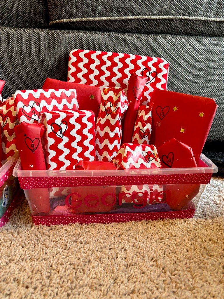 They took small items and wrapped one for each day of December and my kids had a blast. It is something that brought a little joy to each day in December and I want to do the same for the first half of February. I’ll explain more below how to do each version of the box!