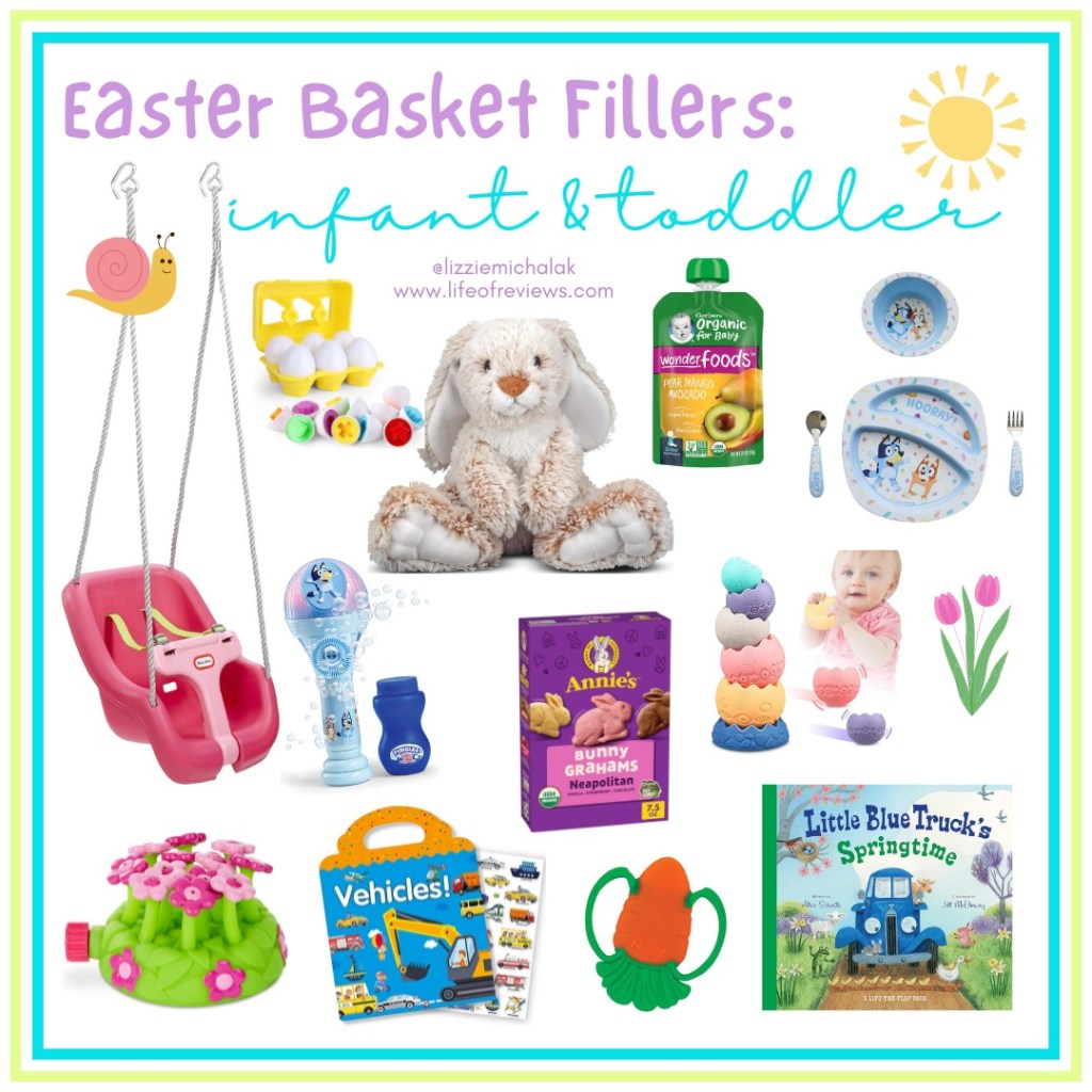Infant & Toddler Baskets: Carrot Teether || Bunny || Egg Shape Matching || Bluey Bubble Wand || Bunny Snacks || Bluey Plate Set || Sensory Stacker || Stickers || Little Blue Truck || Swing || Sprinkler || Gerber Pouches