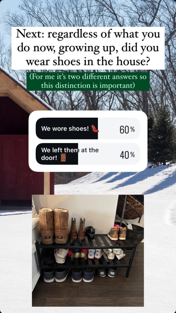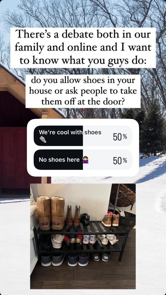 Of the people who said that they wear shoes in the house, about half of them said that it’s either because 1) their partner won’t take their shoes off/disagrees with no shoes in the house OR 2) they don’t want to upset anyone by asking guest to take their shoes off. That was really interesting to me. There were also some people who just didn’t care period, and others who took to my DM’s with really strong opinions. Overall this was such a great conversation.